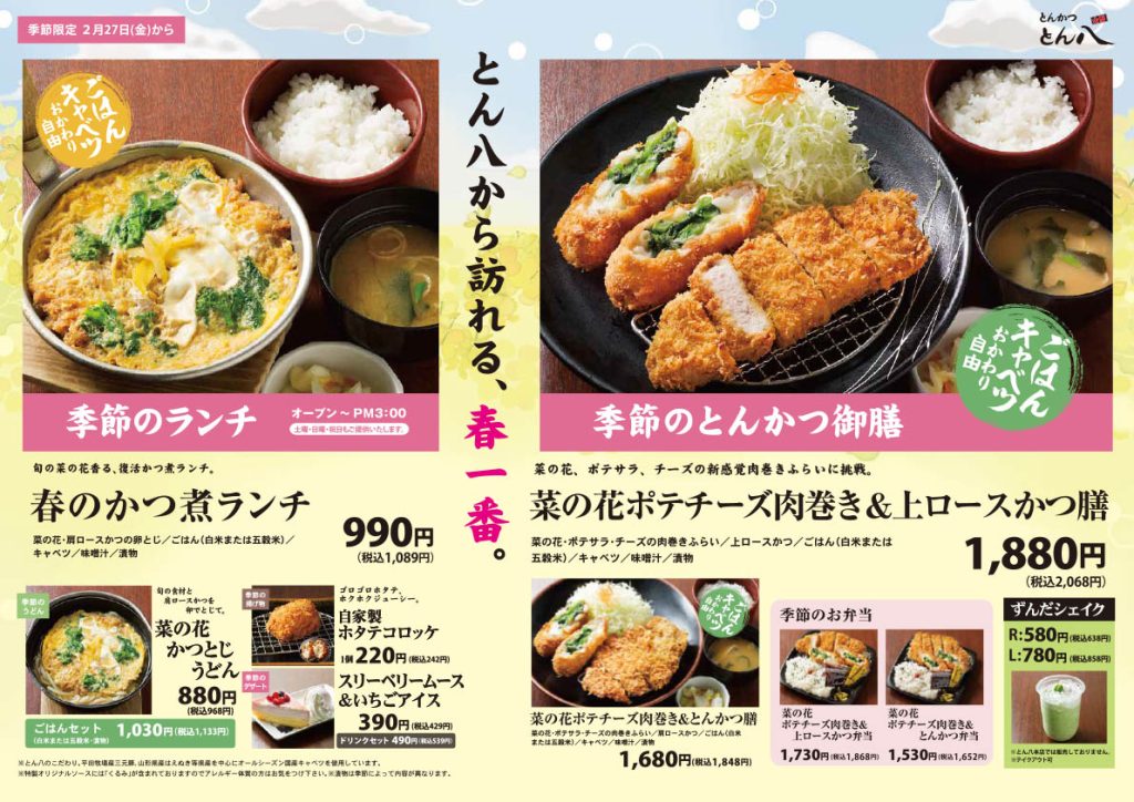2026.03.09 商品情報 【2/27〜】新季節メニューの紹介 【とん八から訪れる、春一番。】 オススメは「菜の花ポテチーズ肉巻き&上ロースかつ膳」 菜の花、ポテサラ、チーズの新感覚肉巻きふらいに挑戦。 季節のうどんには「菜の花かつとじうどん」が登場! 旬の食材と肩ロースかつを卵でとじて。
